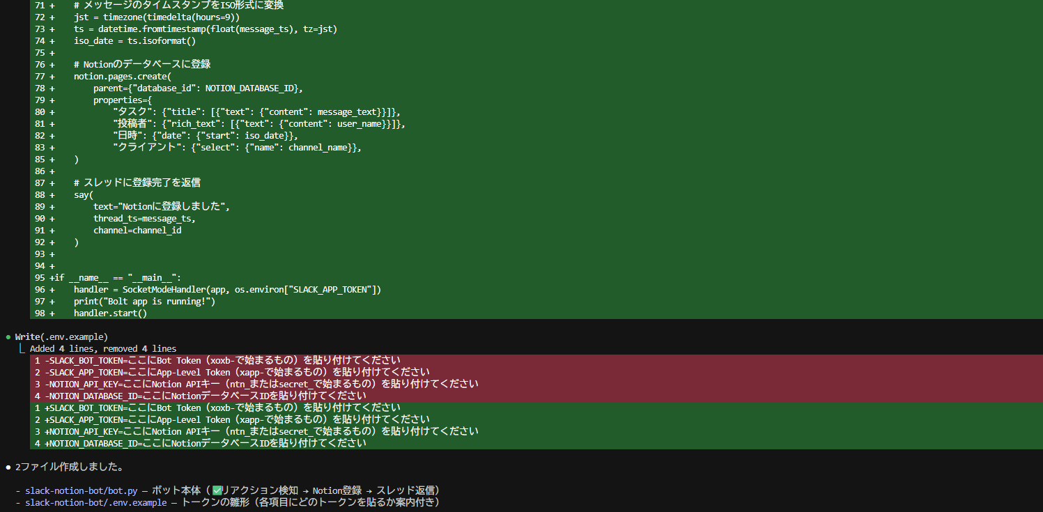 コードの中身を理解する必要はありません。ポイントは、「✅のリアクションを検知→メッセージ取得→Notionに登録→スレッドに返信」という処理が、約100行程度のコードで完結しているということです。この程度の規模であれば、Claude Codeが一度の指示でほぼ完成形を生成してくれます。
