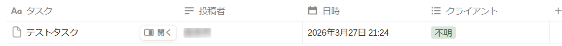 これだけです。Notionに登録されるのは「本文」「投稿者」「日時」「クライアント名」の4項目。クライアント名はSlackのチャンネル名から自動で判定できるため、手動での入力は不要です。