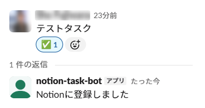 ボットがスレッドで「Notionに登録しました」と返信