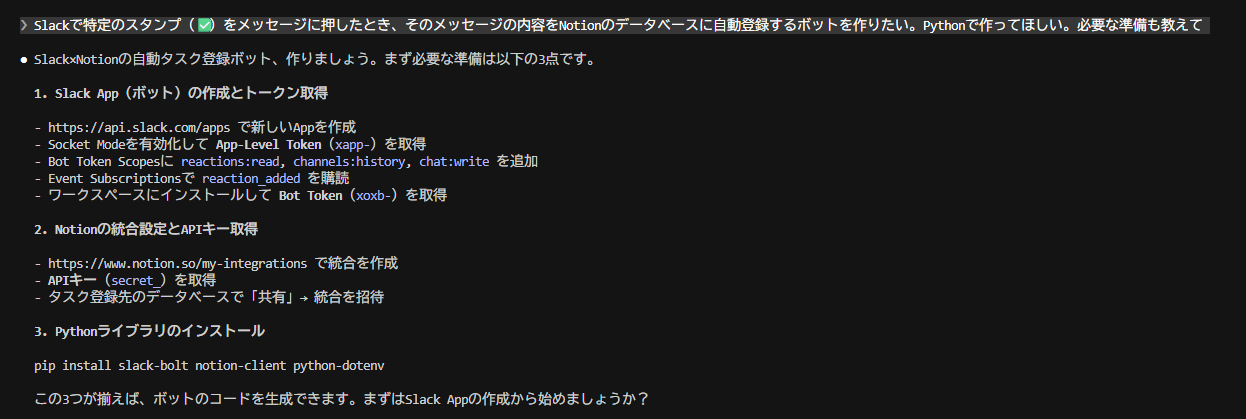 Claude Codeに「このエラーが出るんだけど」と聞いたら、「トークンが`xoxb-`で始まっているか確認してください。`xoxp-`で始まっている場合はUser Tokenです」と回答があり、即座に解決しました。「経験者にとっては自明だが、未経験者には判断しにくいポイント」を的確に教えてくれるのは、非常に助かります。