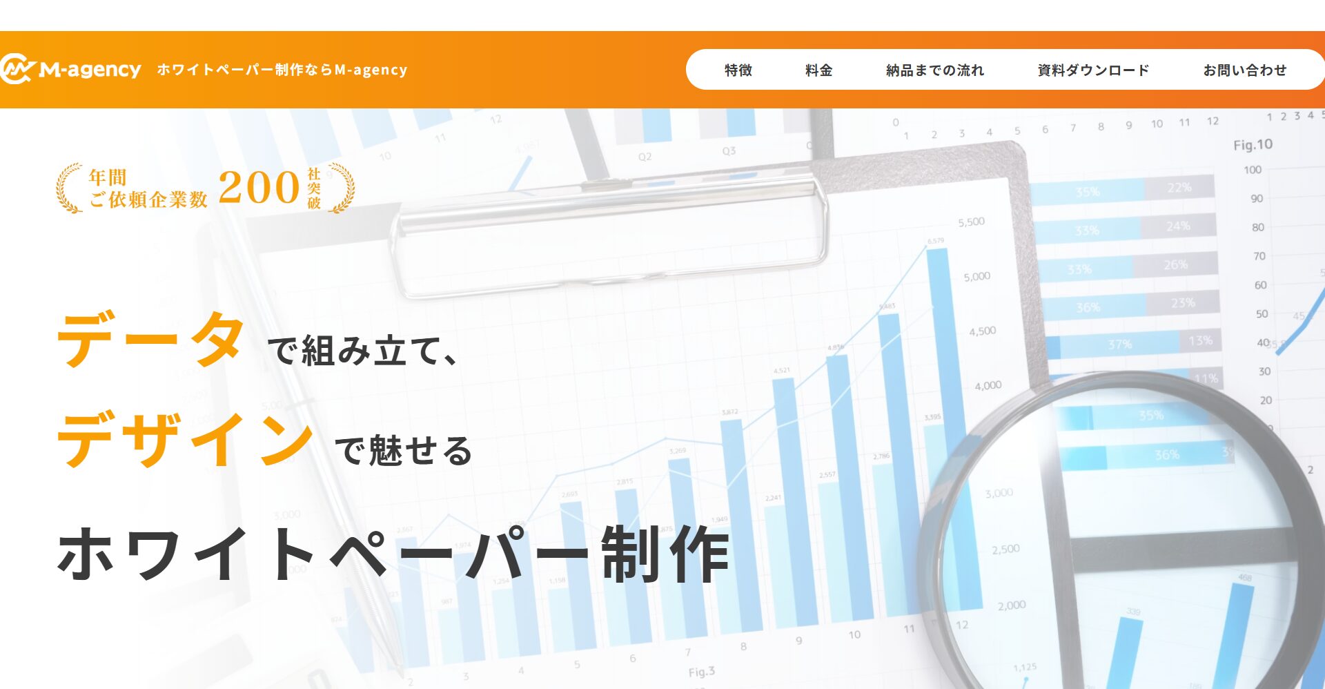 株式会社M-agencyは、「データで組み立て、デザインで魅せる」を理念に、成果に直結するホワイトペーパーを年間200社以上制作する資料制作の専門会社です。ヒアリングから構成・デザイン・ライティングまで一貫対応し、プロのデザイン力とデータ分析で“伝わる・惹きつける“資料を実現します。