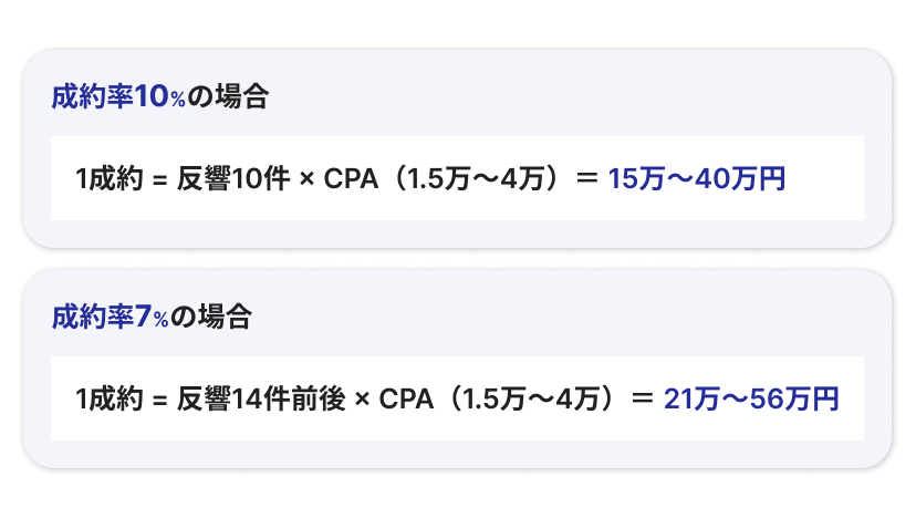 この前提だと、広告費だけで見た1成約あたりの広告費はざっくりこうなります。