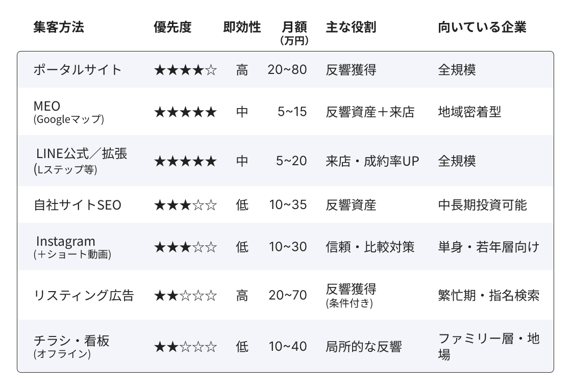 本記事では、不動産賃貸仲介の集客を、予算別(月30万円〜1億円超)にどう設計し、何を判断軸にすべきかに焦点を当てています。